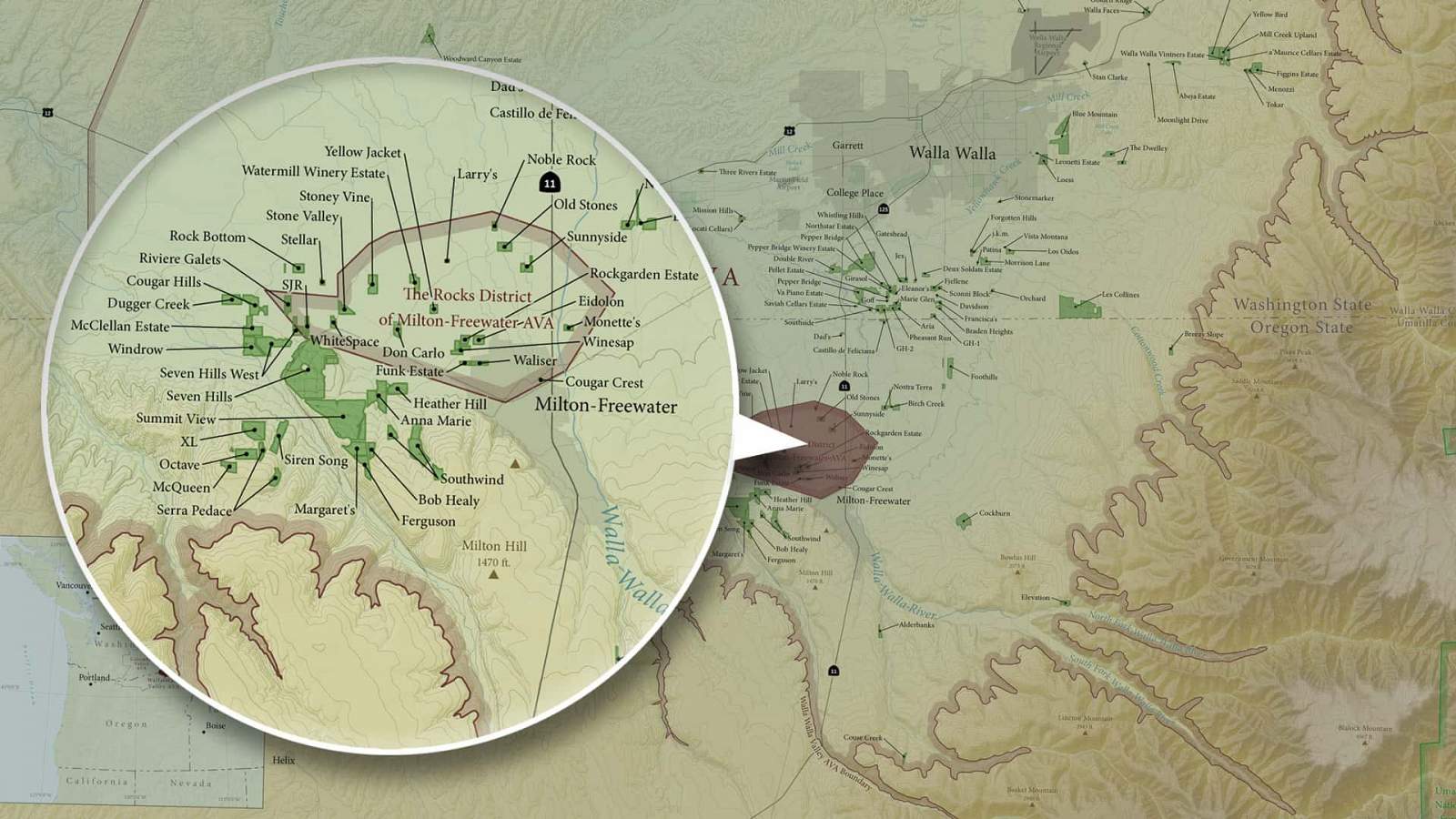 A map showing the larger WW Valley AVA and the nested Rocks District AVA